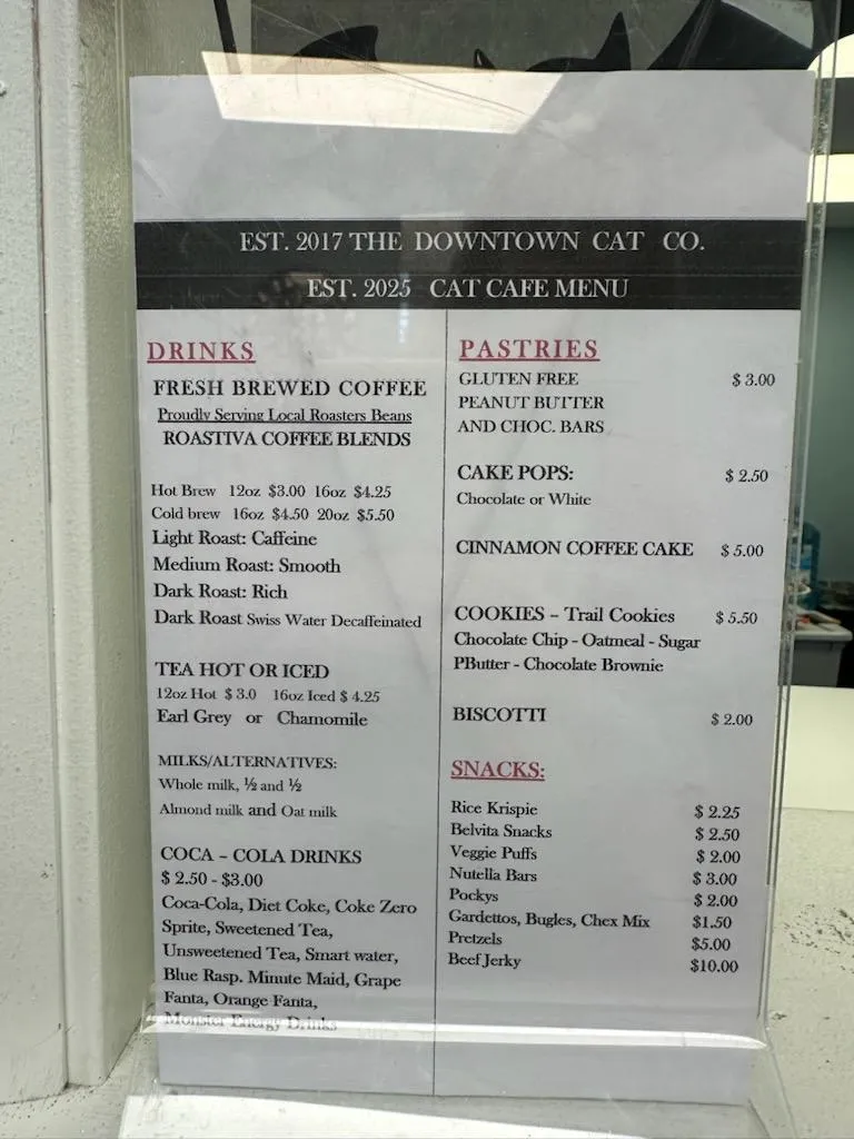Discover a cozy retreat at The Downtown Cat Company & Cafe - unwind with delightful coffee as you cuddle with our friendly resident cats. Join our purr-fect community! Come over for a meow-gical brew! At our Cat Café, your coffee comes with a purr and your brownies with a side of whiskers. Quench your thirst with our cool iced teas or fizz up your day with soda. Need a zap? Grab an energy drink! And for the nibblers, we've got snacks galore. Come for the cuddles, stay for the munchies! 🐾☕🍪